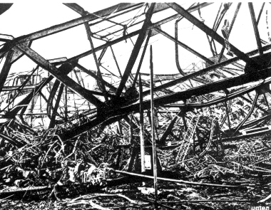 durch Knallgas-Explosion zerstörteHalle in Ahlhorn